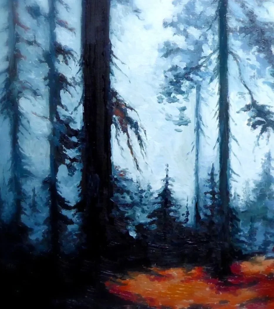 A dark forest created in oil paints.